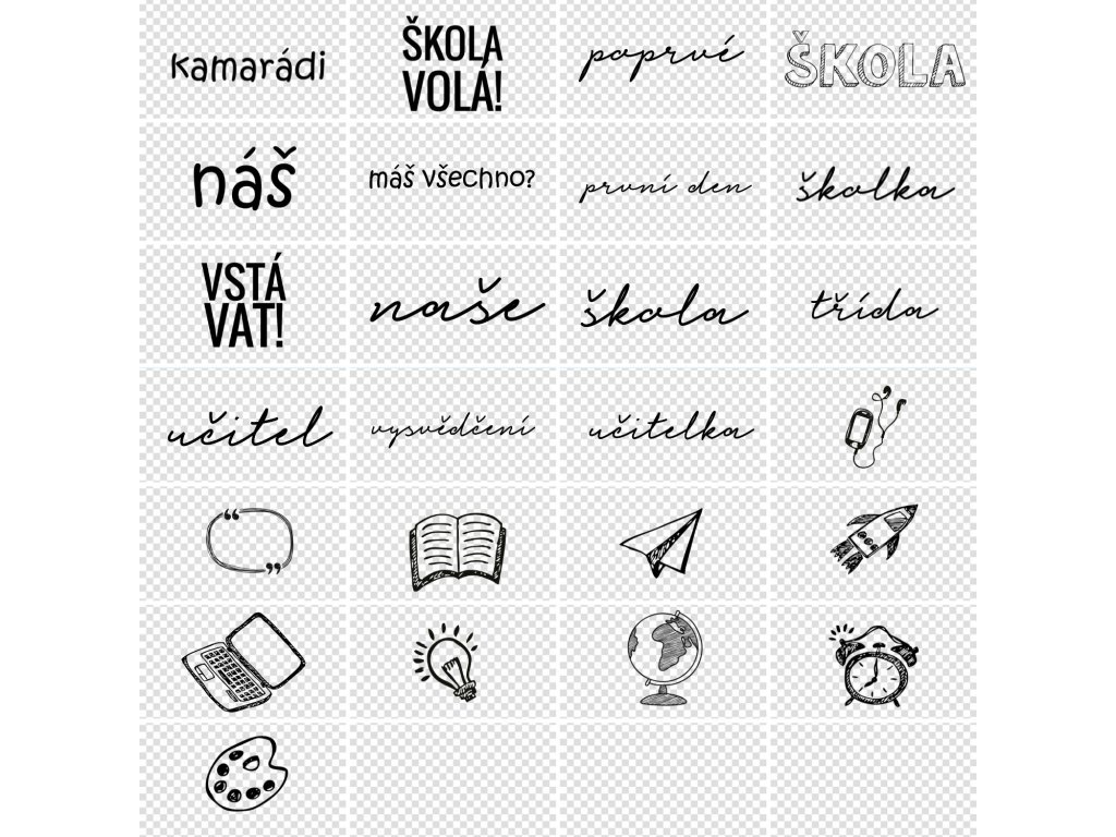 Digitální rámečky, nápisy, bordury a obrázky pro kreativní tvoření se školní tematikou. Jednotlivé prvky můžeš využít k ozvláštění fotek, fotoalba nebo fotoknihy a na jiné projekty. Snadno použitelné v grafických editorech.