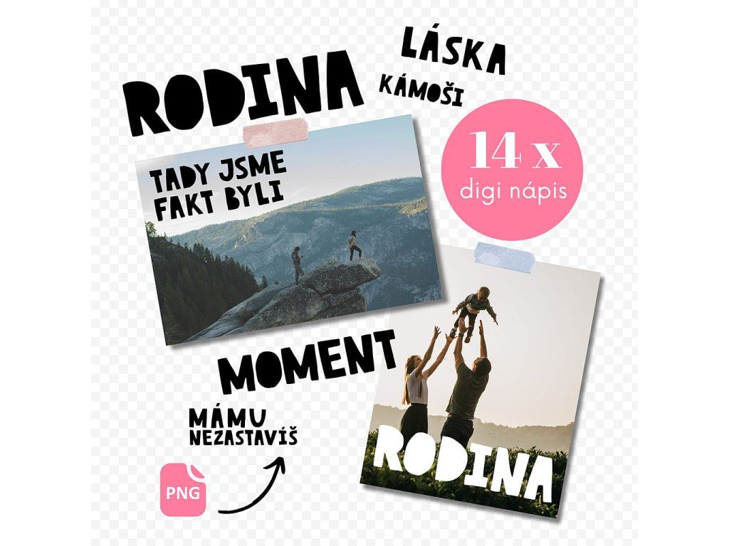 Upozornění: Nápisy jsou určeny pouze k použití pro vlastní potřebu, nebo pro tvé klienty, pokud jsi například fotograf/ka. Není povoleno použít náš produkt pro další komerční produkci, sdílet, přeprodávat ani prezentovat produkt jako vlastní.
