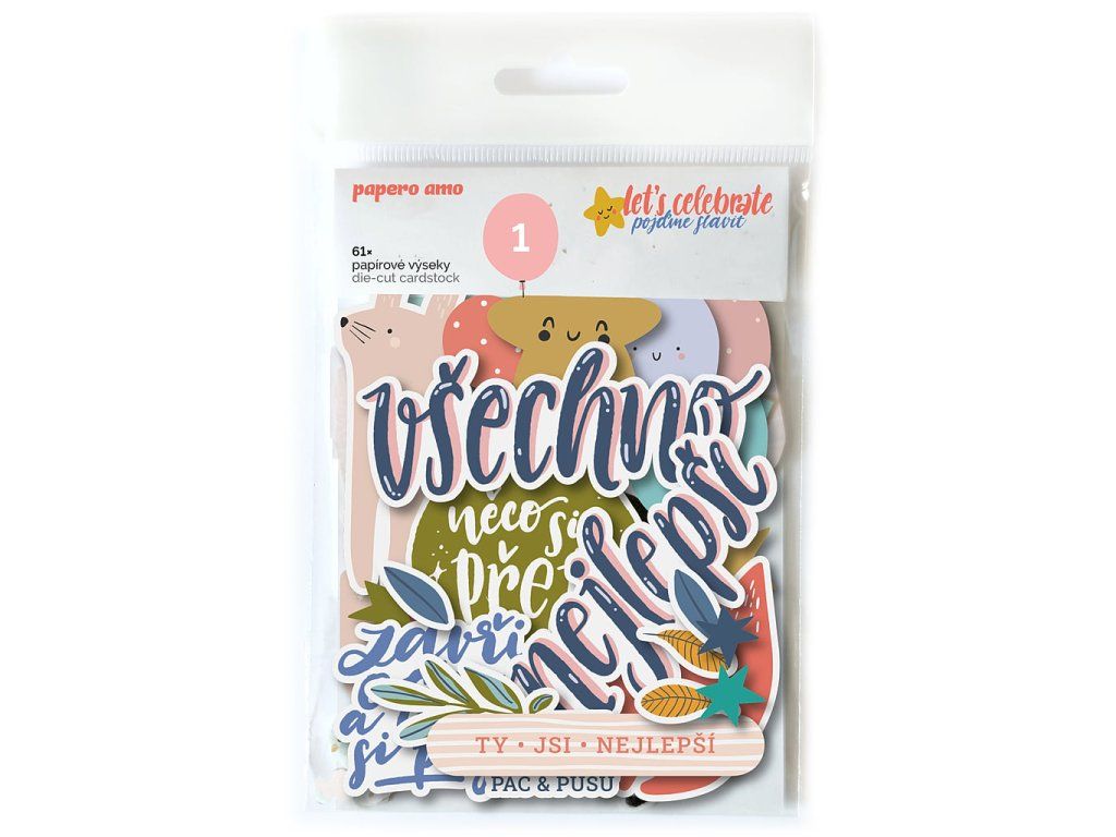 2 x sada papírových výseků (61 a 76 ks), na lepení použijte oboustrannou lepící pásku nebo 3D lepící čtverečky - není součástí balíčku