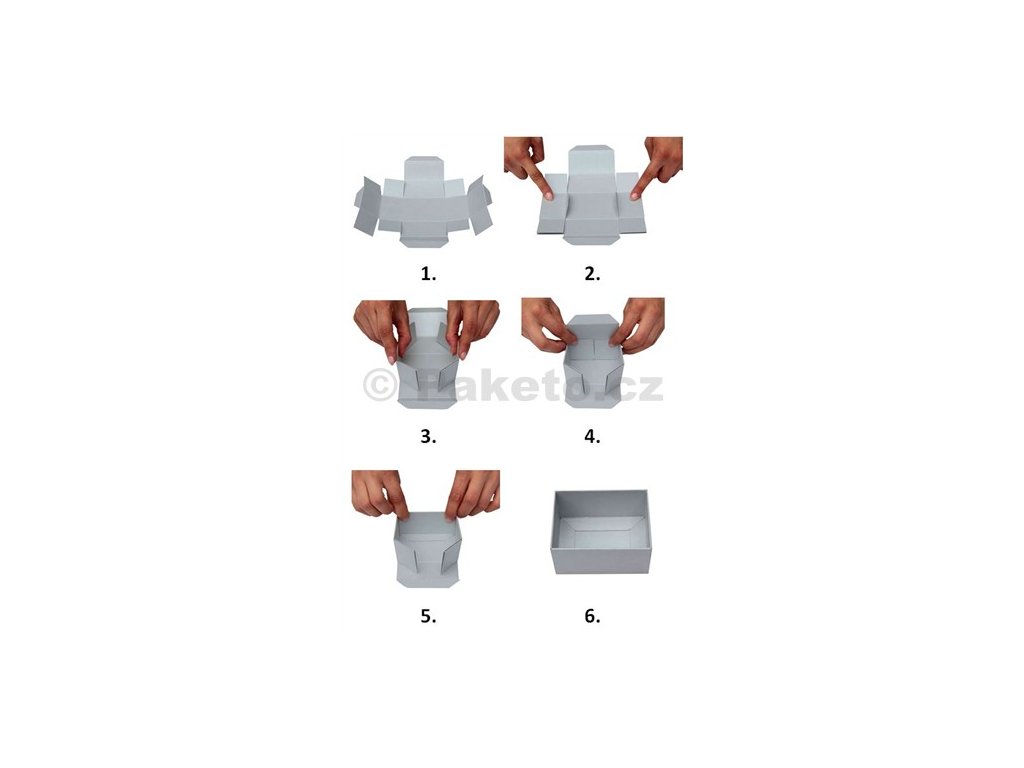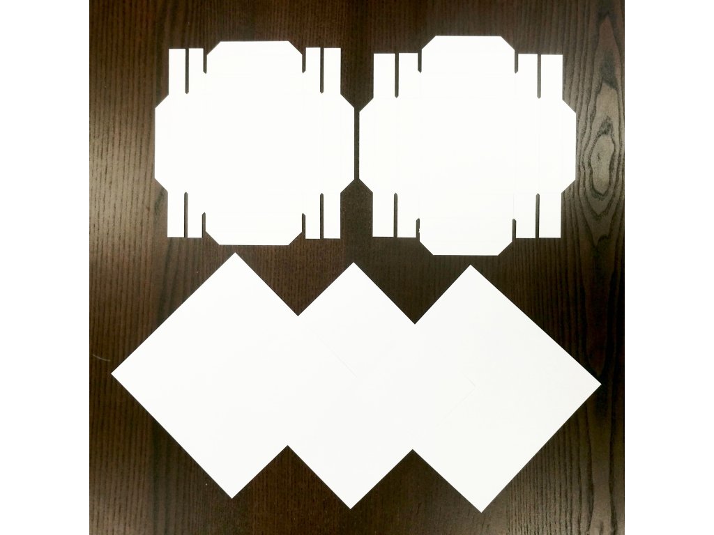 BALENÍ OBSAHUJE: krabičku, víčko (rozložené) a 3 narýhovavé čtvrtky o rozměru 19 x 19 cm - bílá barva.