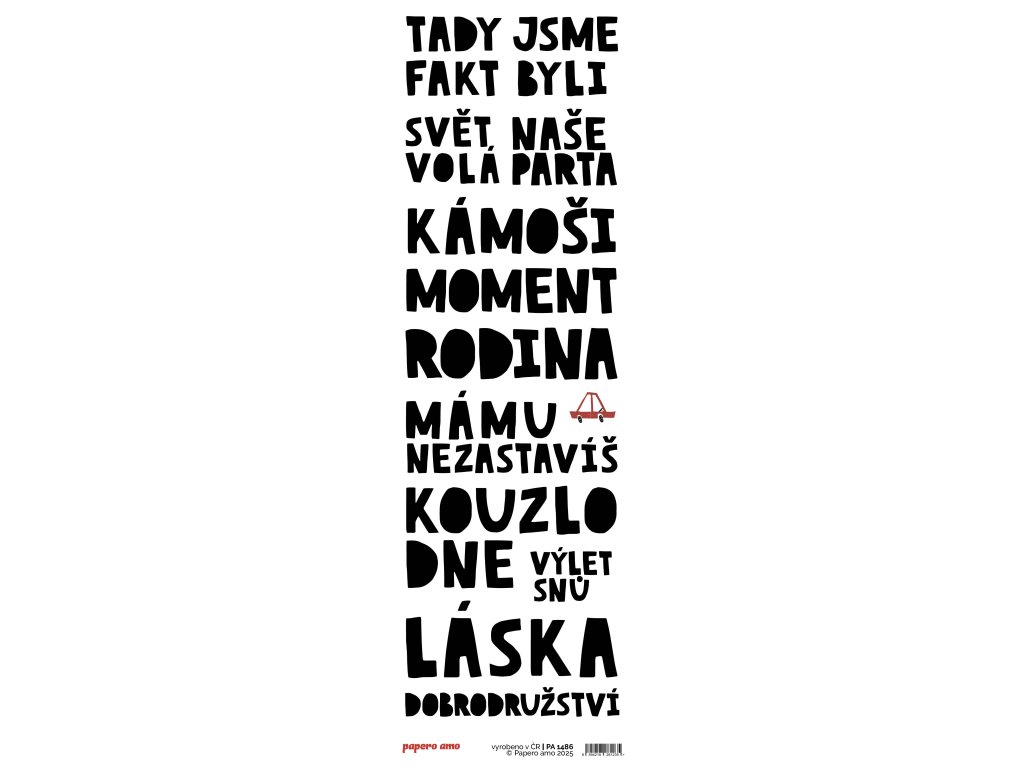 1x arch s vyseknutými nápisy ve formátu 10 x 30,5 cm (stačí vyloupnout a použít)
