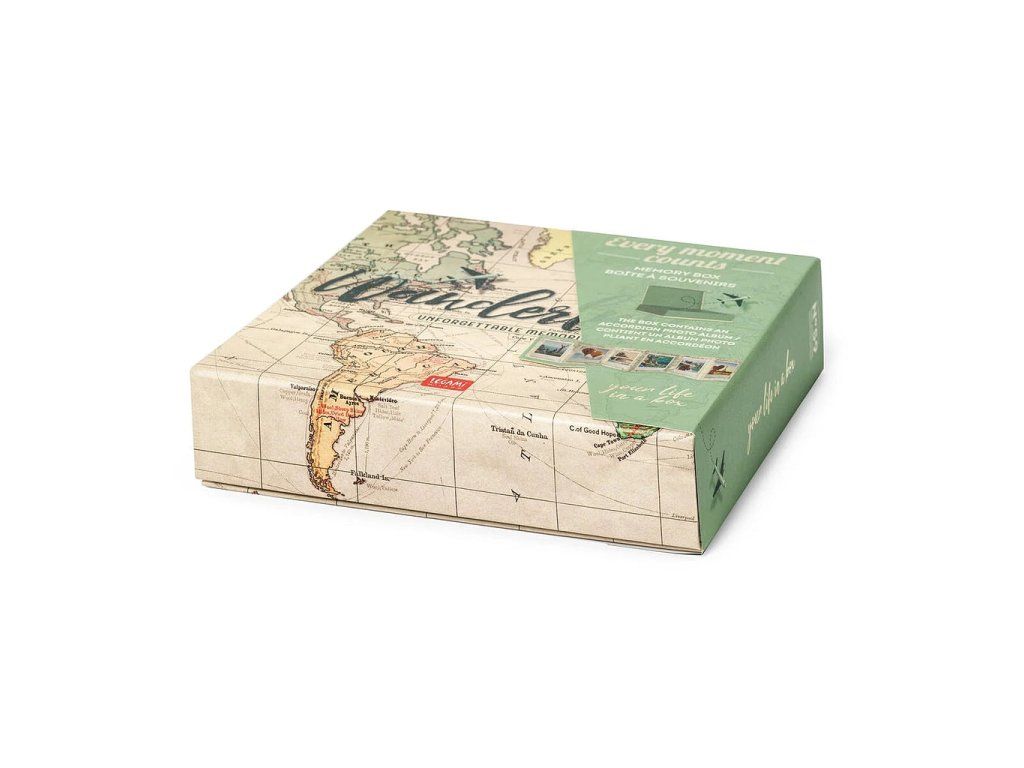 Místo pro všechny tvoje cestovní vzpomínky. Legami Krabička vzpomínek s cestovním motivem obsahuje skládací harmonikové fotoalbum připravené pojmout nejkrásnější fotografie z tvých cest. Kromě harmonikového alba pojme krabička tak například vstupenky, pohledy, jízdenky a jiné drobné předměty.