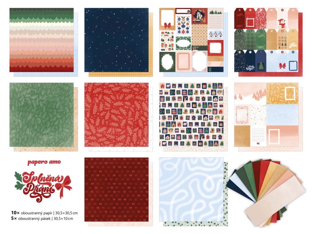 Kompletní sada oboustranných papírů na scrapbooking z vánoční kolekce Splněná přání. Vhodné na výrobu vánočních fotoalb, minialb, scrapbookových stránek a Project Life stránek, originálních přáníček, dárkových krabiček, visaček a spoustu dalších kreativních projektů.