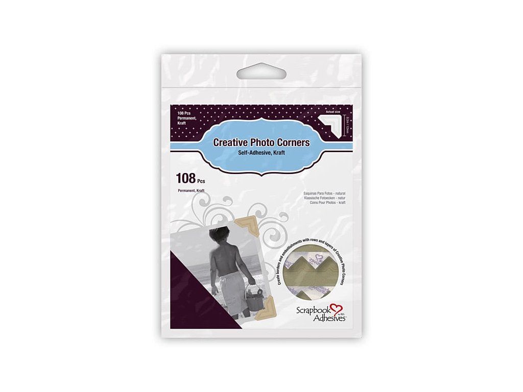 Dekorativní samolepící rožky na fotografie. S ozdobných embossovaným detailem. Skvělý pomocník na scrapbooking. Pomocí rožků snadno přilepíš fotografie do alba.