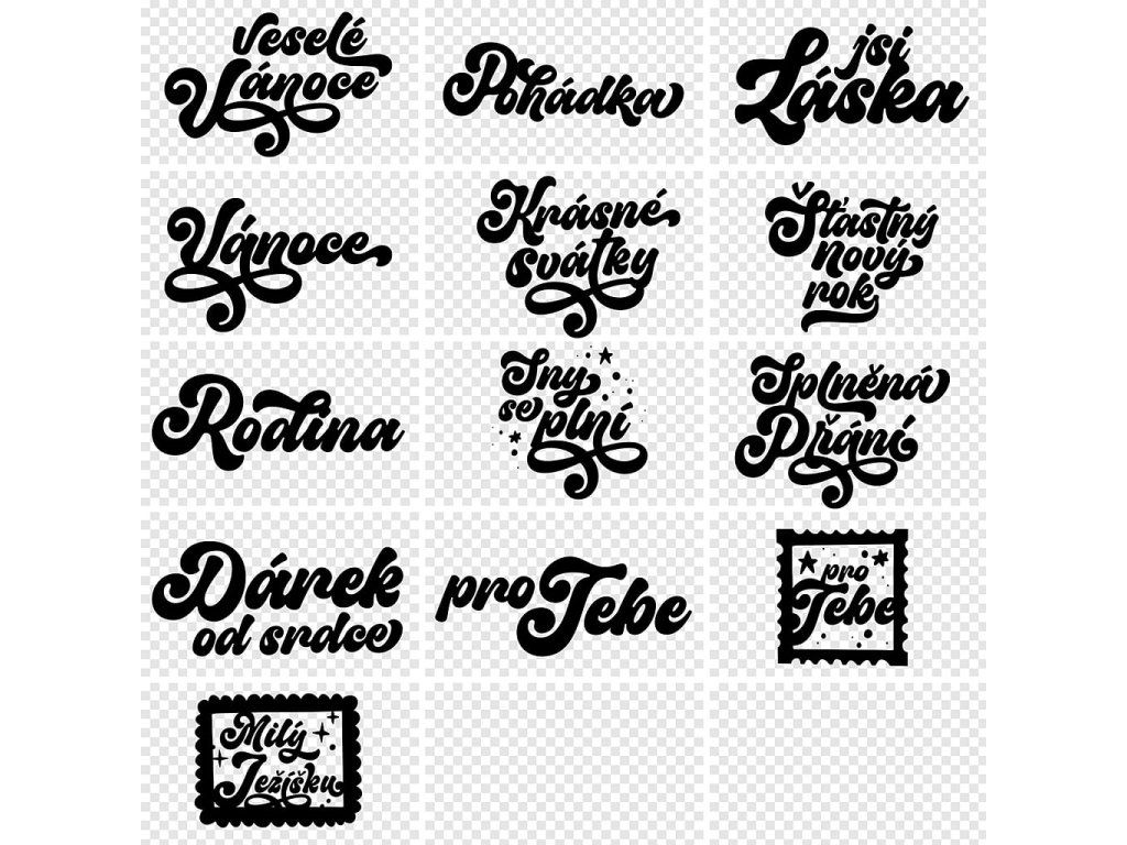 České digitální nápisy z vánoční kolekce Splněná přání. Nápisy můžeš využít k ozvláštění fotek, fotoalba nebo fotoknihy a hlavně na vánoční přání - ta papírová, ale i ta která posíláš rodině a kamarádům online. Ať už máš momentku z pečení perníčků nebo profi fotky od fotografa, doplň k ní nápis či jiný text a popřej Splněná přání všem blízkým. Nápisy jsou snadno použitelné v běžně dostupných grafických editorech jako je například Canva.