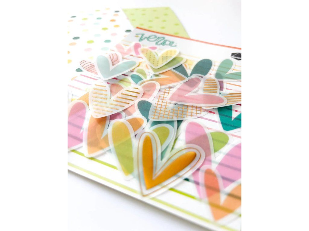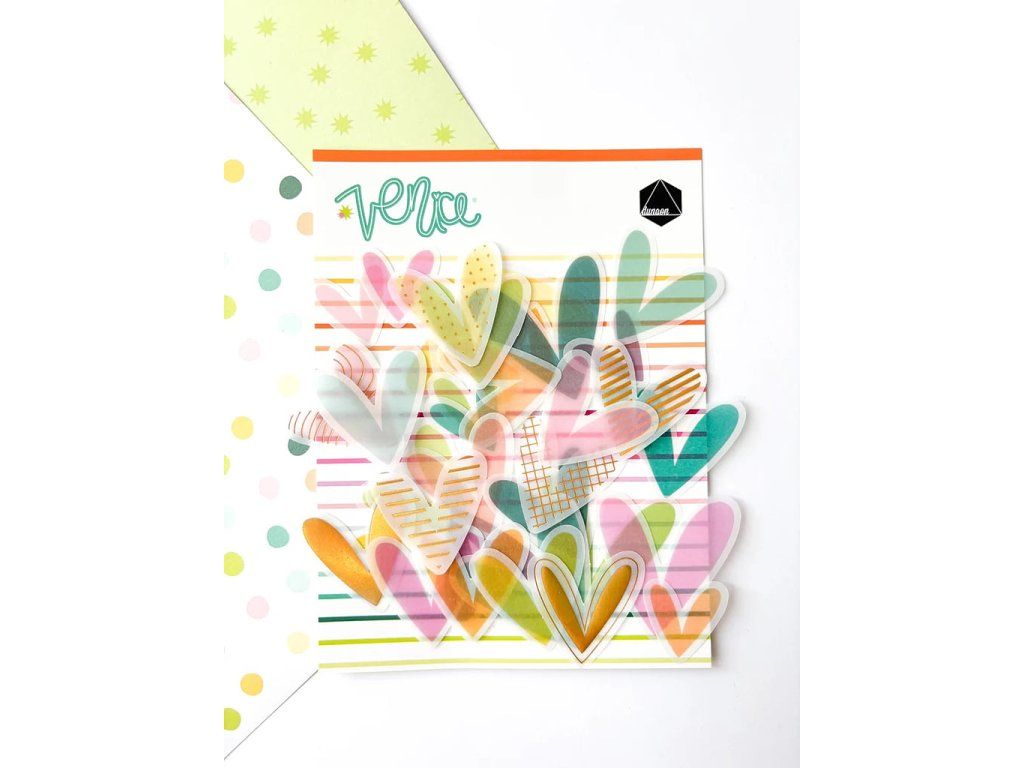 Sada vellumových výseků ve tvaru srdce s metalickým duhovým efektem. Výseky ladí ke kolekci Venice od španělské značky Dunaon. Skvělé na tvoření z papíru - výrobu přáníček, fotoalb, deníků, do diáře a na další projekty.