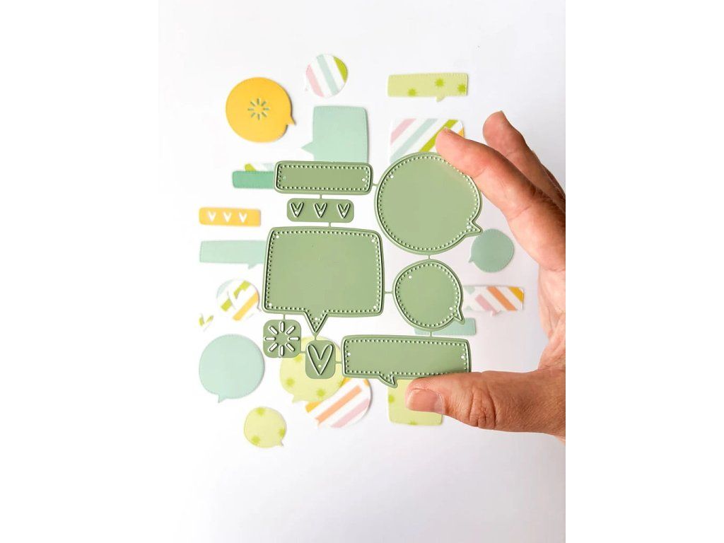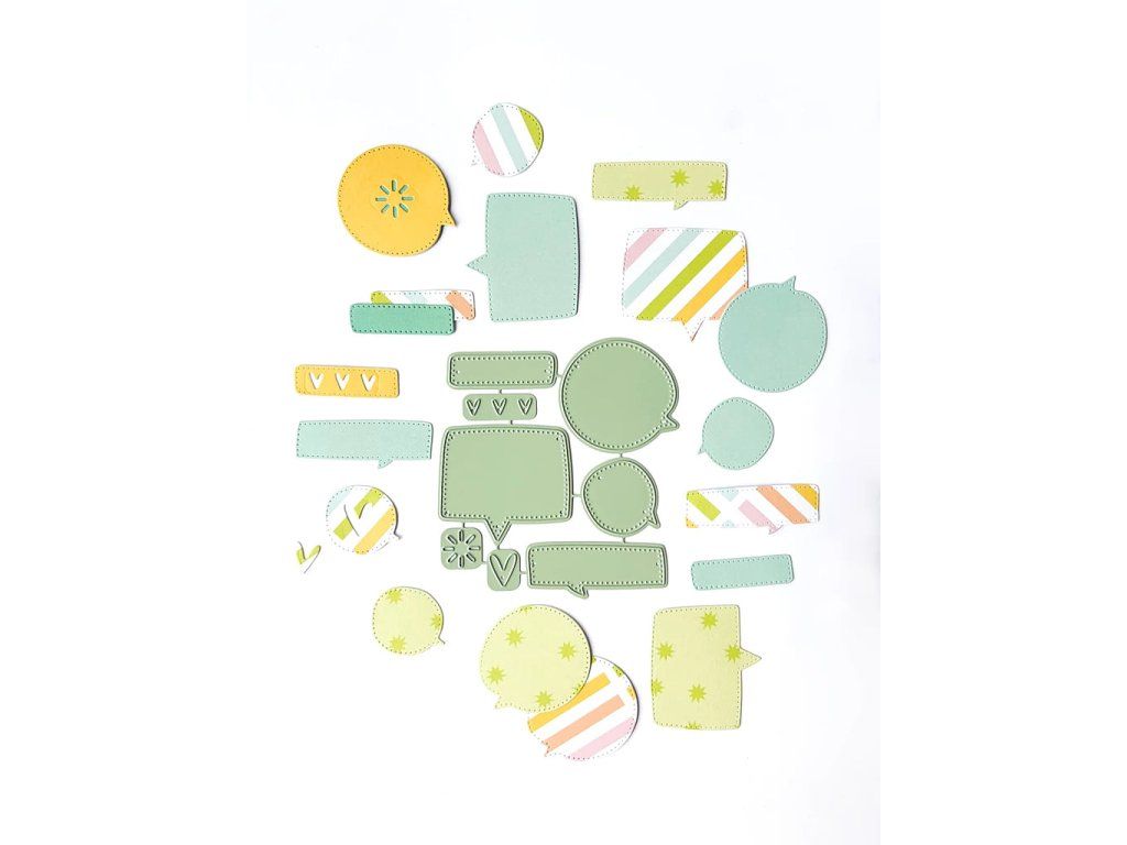 Výseky ve stylu komiksových bublin s oblými okraji a prošitím po obvodu. Šablony jsou vyrobeny z vysoce kvalitní oceli. Nezapomeň odstřihnout malý kovový spoj mezi jednotlivými díly pro jejich správnou funkci.